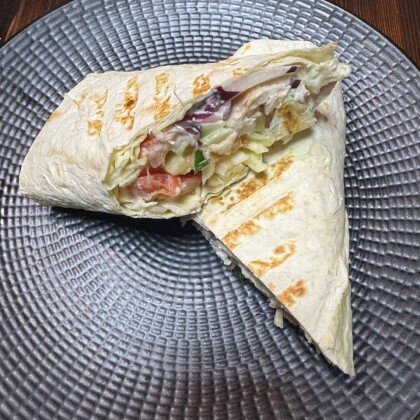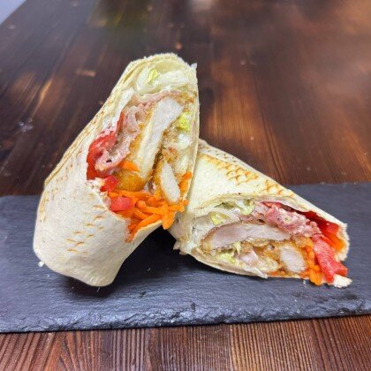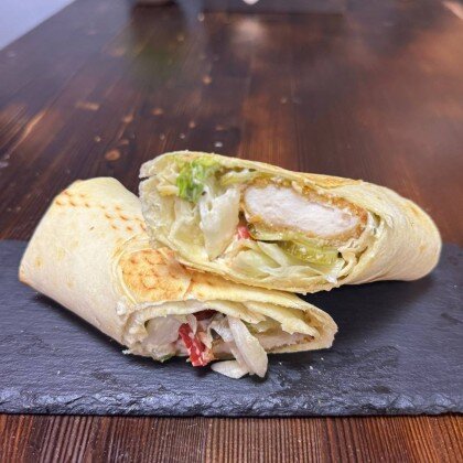 Курица, халапеньо, моцарелла, морковь по-корейски, капуста, томат, огурец, соус, лук красный.
