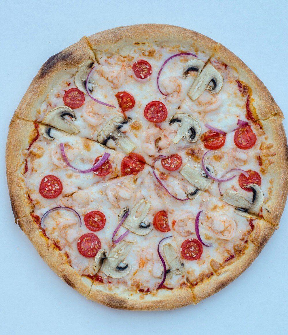 Тесто, соус том ям, сыр моцарелла, креветки, черри, шампиньоны, лук красный, кунжут.