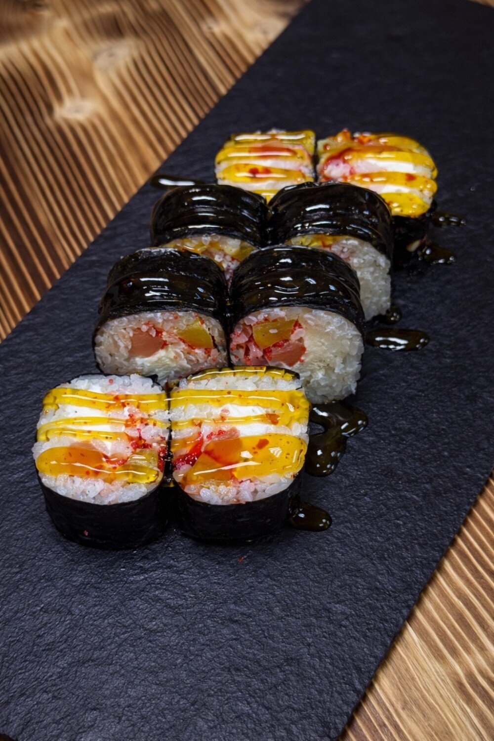 Нори, рис, творожный сыр, креветки, лосось, такуан, икра масаго, соус манго-чили