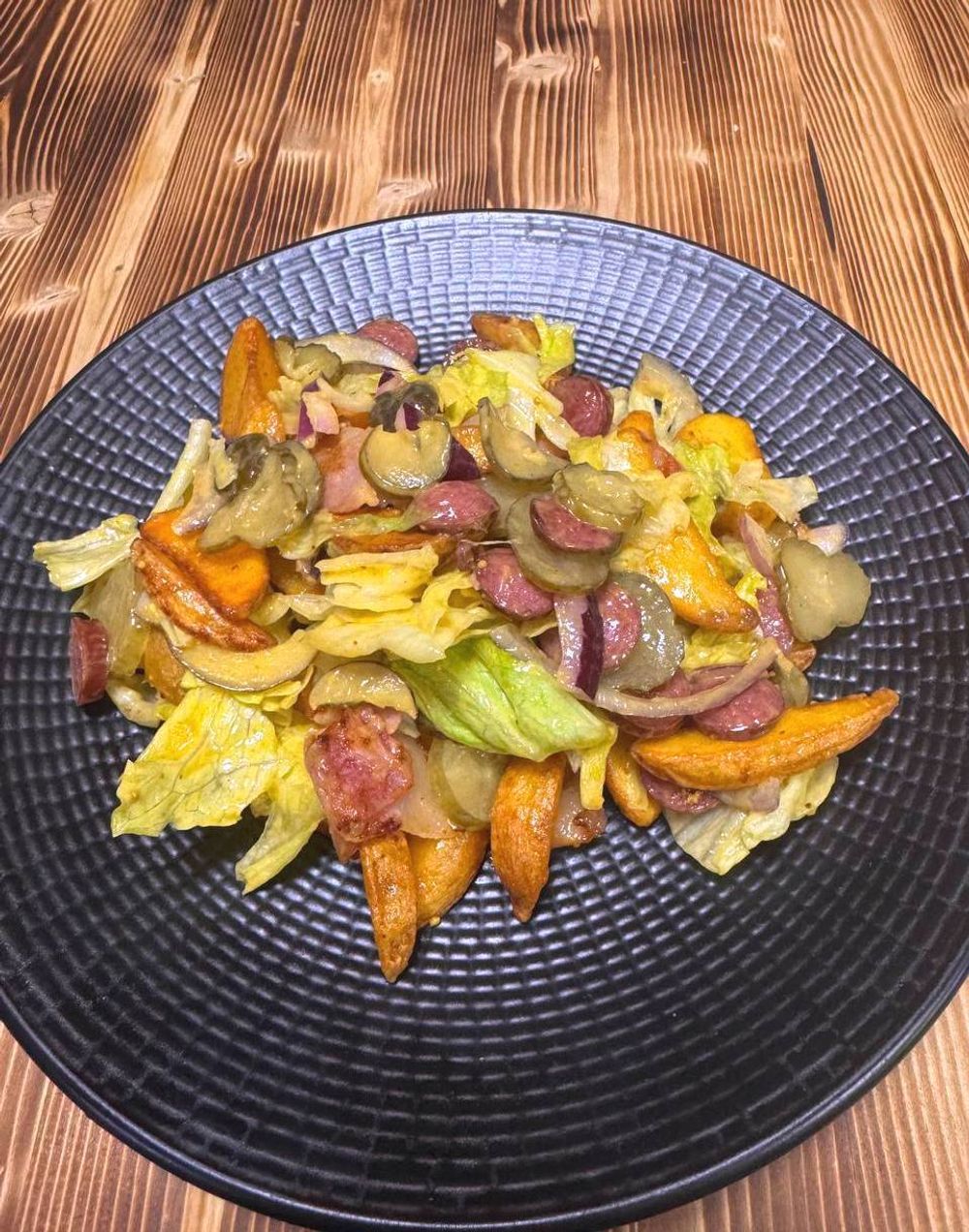 Салат айсберг, колбаски баварские, бекон, соус горчичный, картофель по-деревенски, огурец маринованный, лук красный.