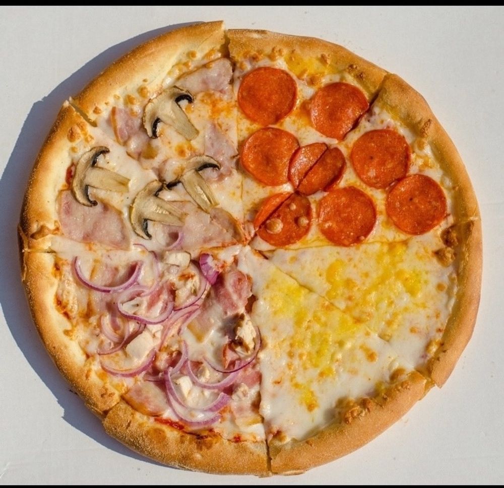 Тесто, соус томатный, сыр моцарелла, пепперони, 3 вида сыра, ветчина, грибы, лук, курица п/к