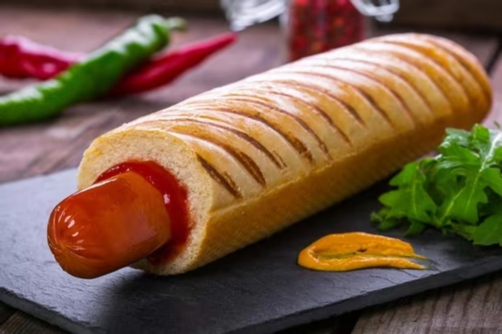 Булочка, сосиска, соус горчичный, соус 1000 островов.