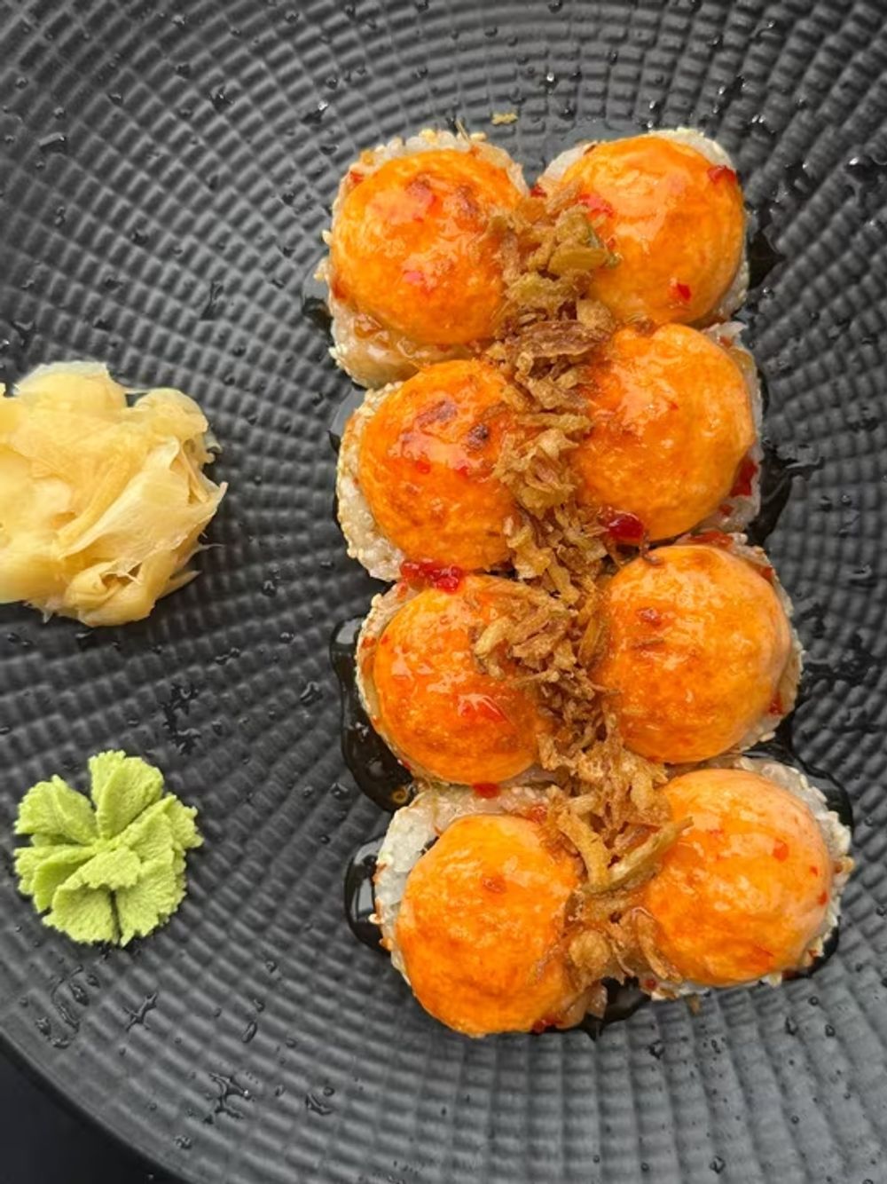Рис, нори, кунжут, сырная шапочка. курица, сыр, соус сладкий чили, криспи лук