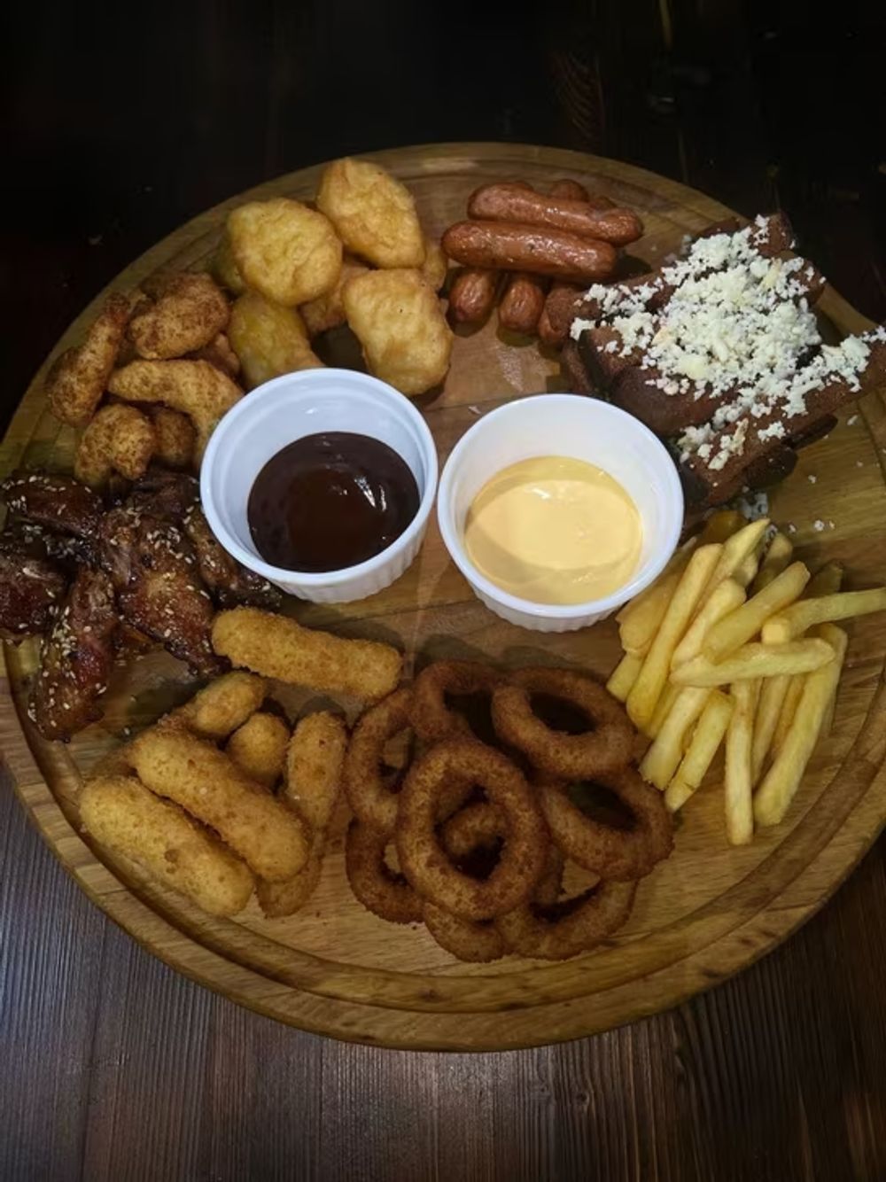 Креветки в темпуре ,наггетсы куриные, картофель фри, крылья терияки, колбаски для гриля, сырные палочки, луковые кольца, гренки.