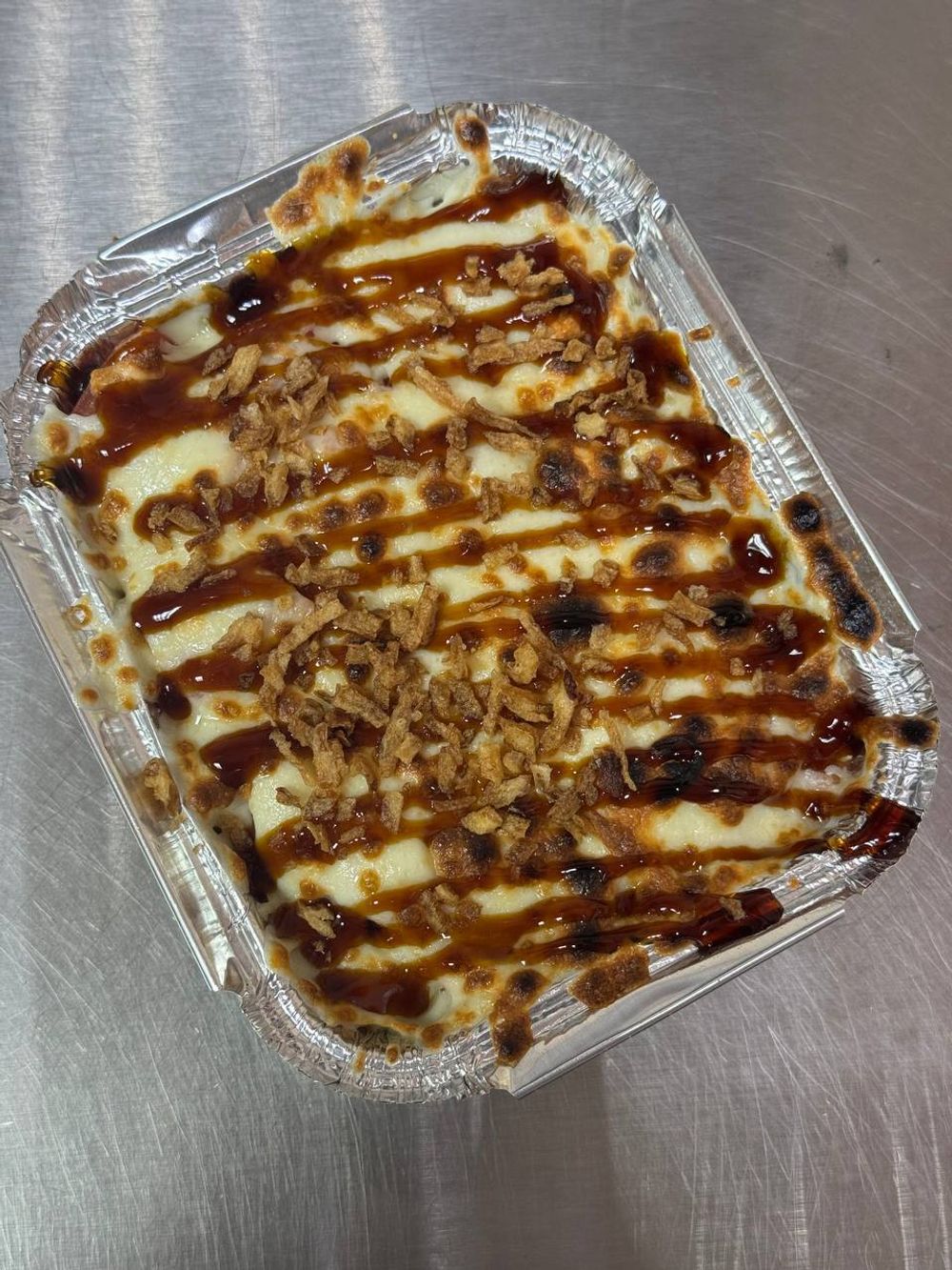 рис, курица, томат , белый соус, сыр моцарелла, унаги соус, лук криспи