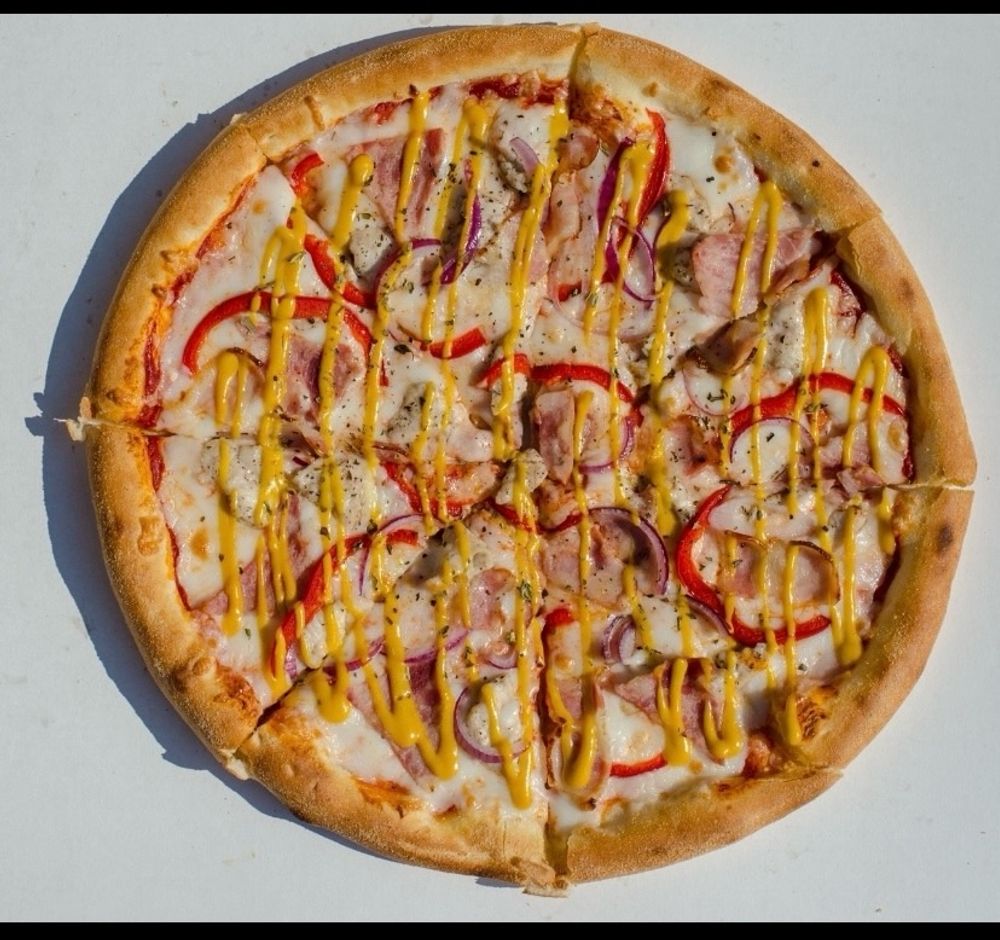 Тесто, красный соус, сыр моцарелла, куриная грудка(маринованная с чесноком), бекон, перец болгарский, ветчина, соус горчичный.