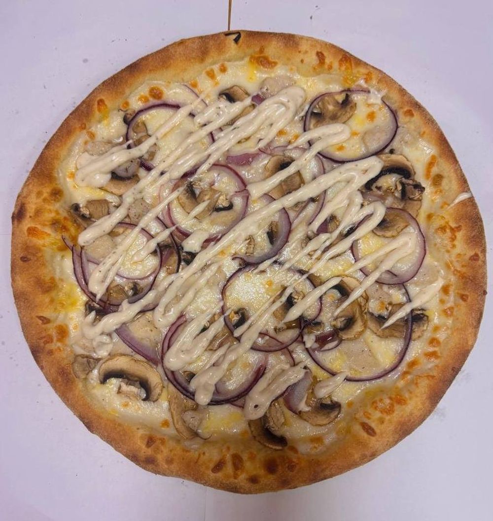Тесто, сливочный соус, чеснок, шампиньоны, лук красный, цыпленок, грибной соус.