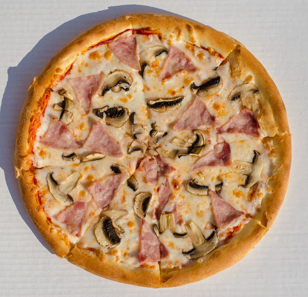 Тесто, соус томатный, сыр моцарелла, ветчина, шампиньоны.