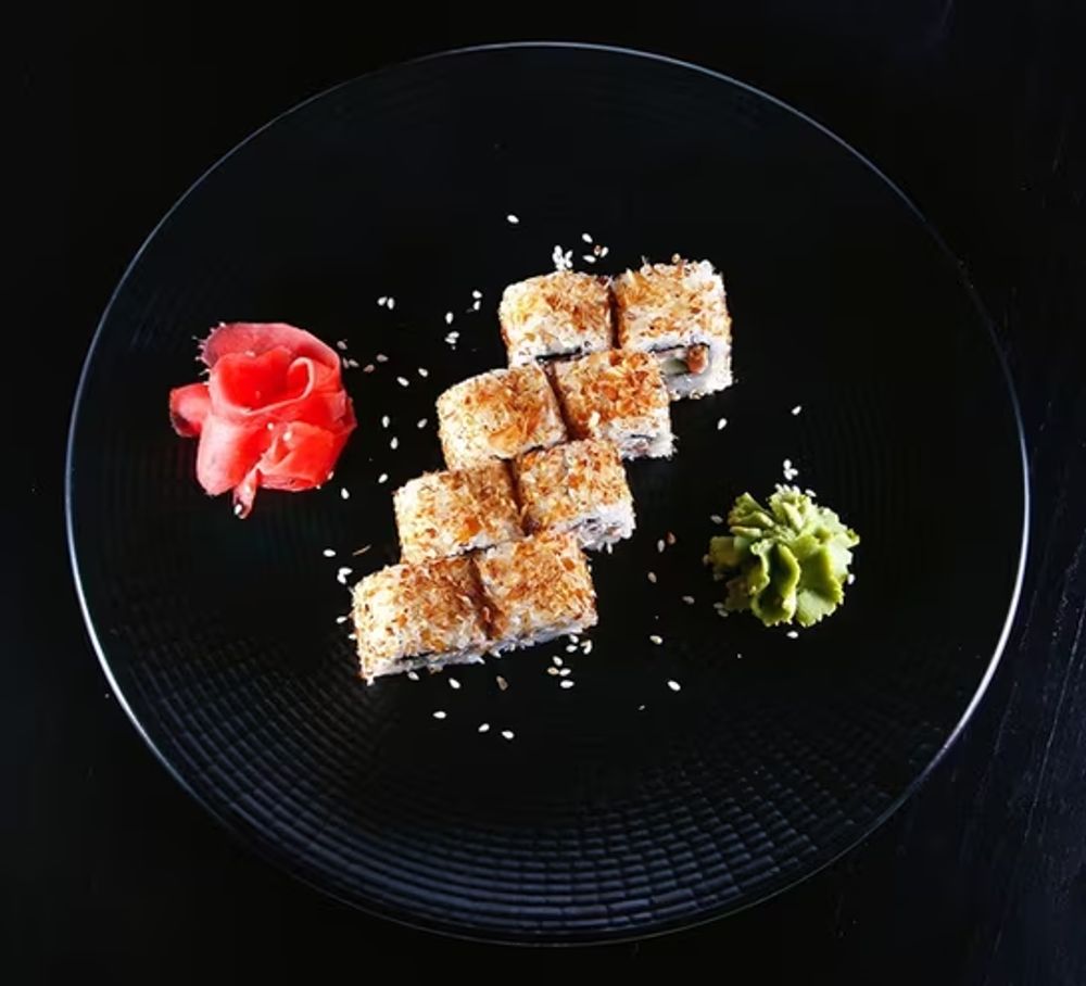 Рис, угорь, огурец, спайси соус, стружка тунца.