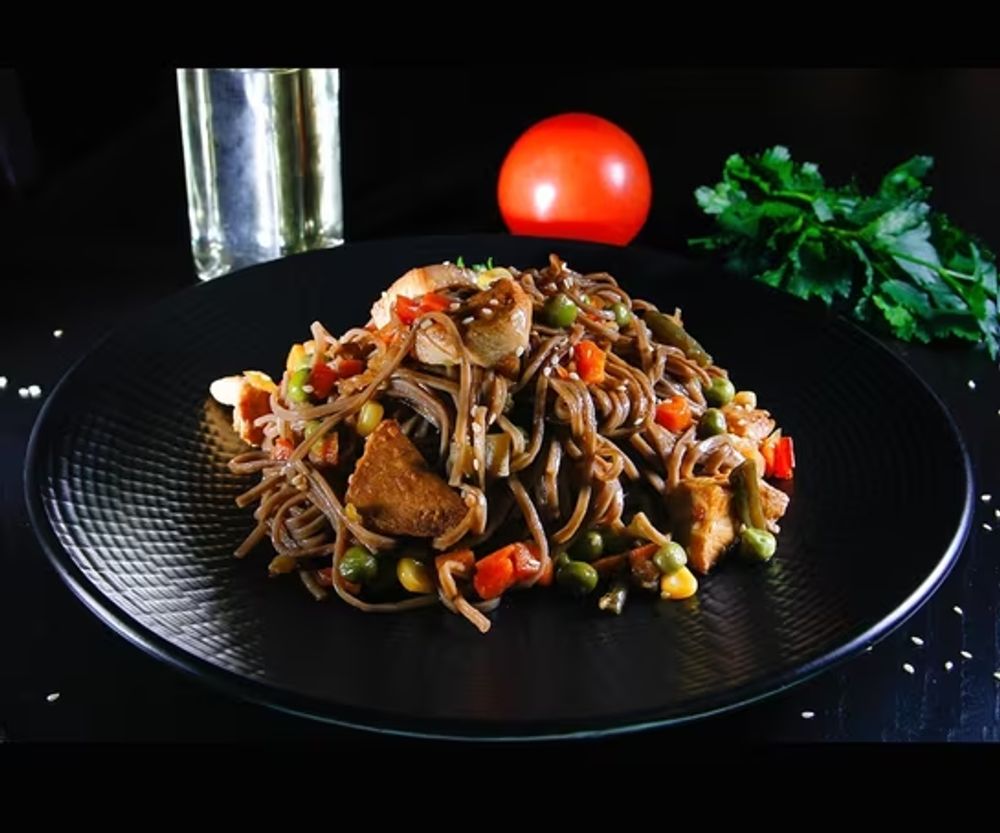 Гречневая лапша, мексиканская смесь, терияке, соевый соус, кимчи.