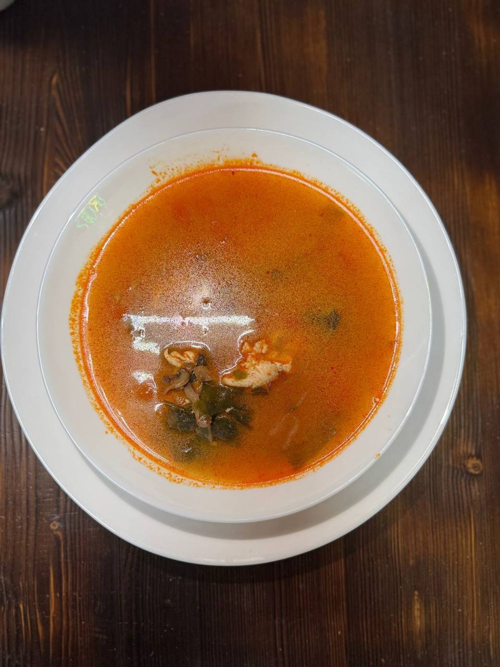 Бульон, бульон хандаши, кимчи, паста том ям ,грибы шампиньоны, курица, кокосовое молоко, томаты черри, рис