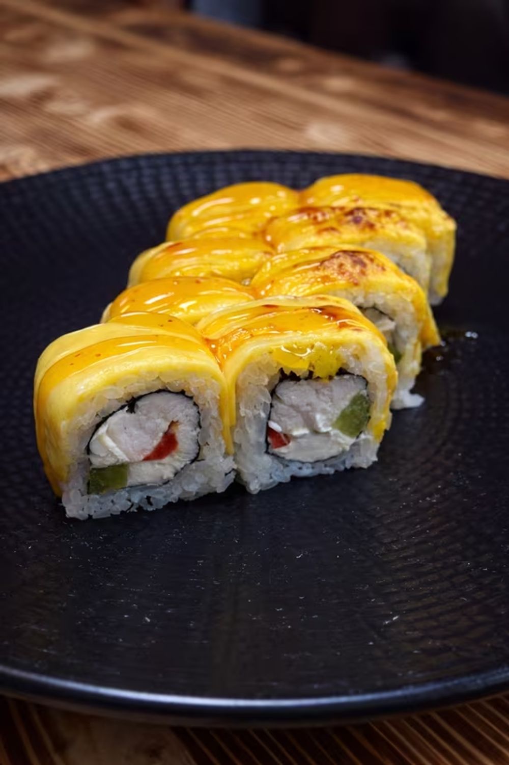 Рис, нори, сыр творожный, перец болгарский, такуан, курица, сыр чеддер, соус манго-чили