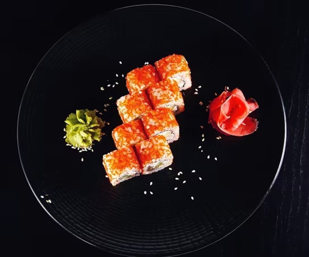 Рис, нори, лосось с/м, угорь, сыр, огурец, тобико.