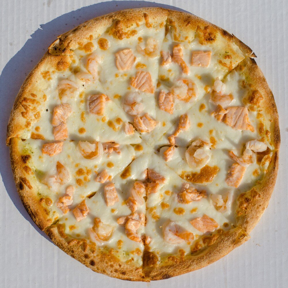 Тесто, соус белый , сыр моцарелла, лосось, креветки, чеснок гран.