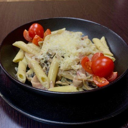 Бекон, сливки, лук, спагетти, пармезан, черри.