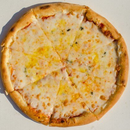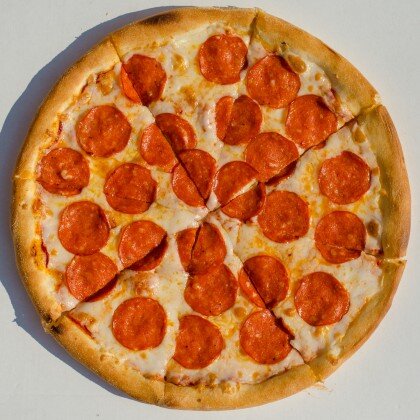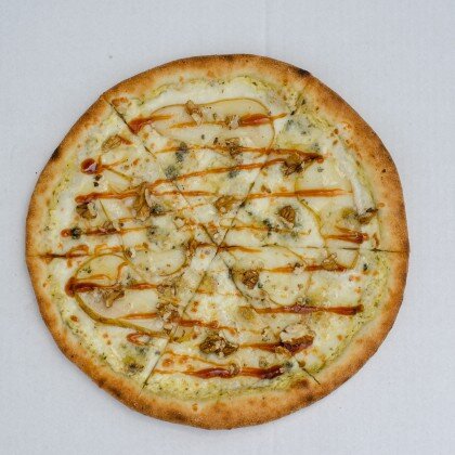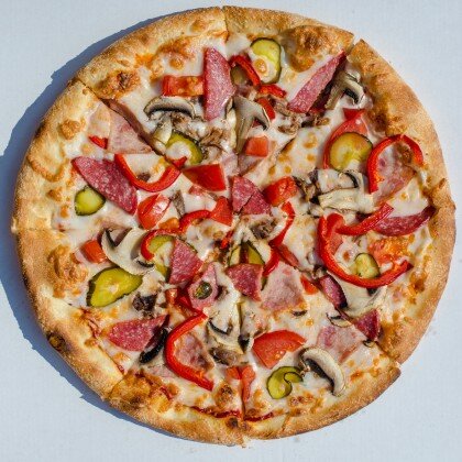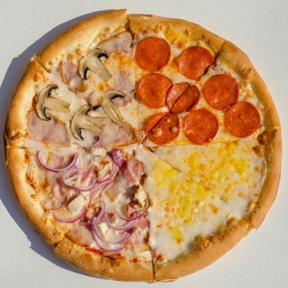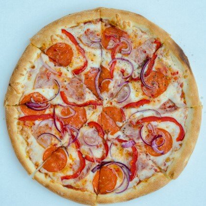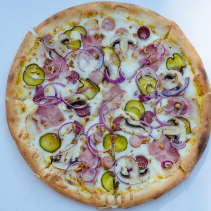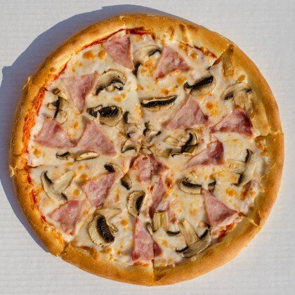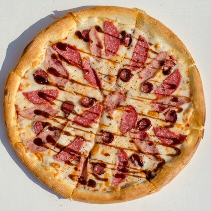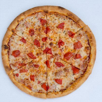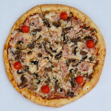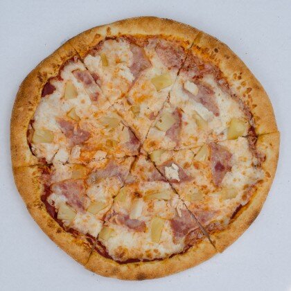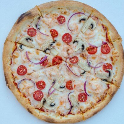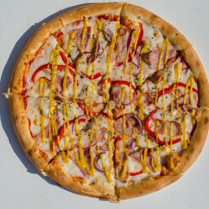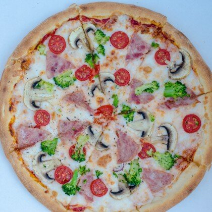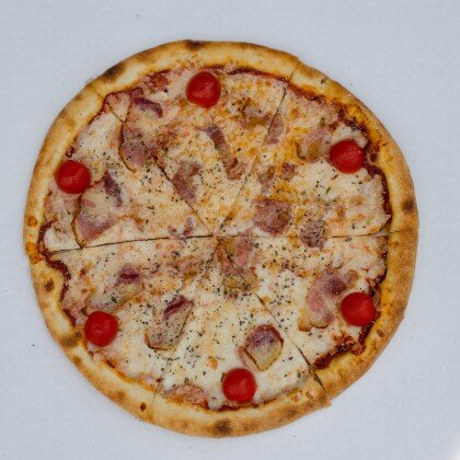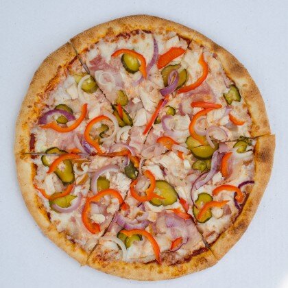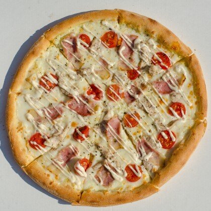 Тесто, соус белый, сыр моцарелла, курица п/к, салат айсберг, томат черри, сыр пармезан