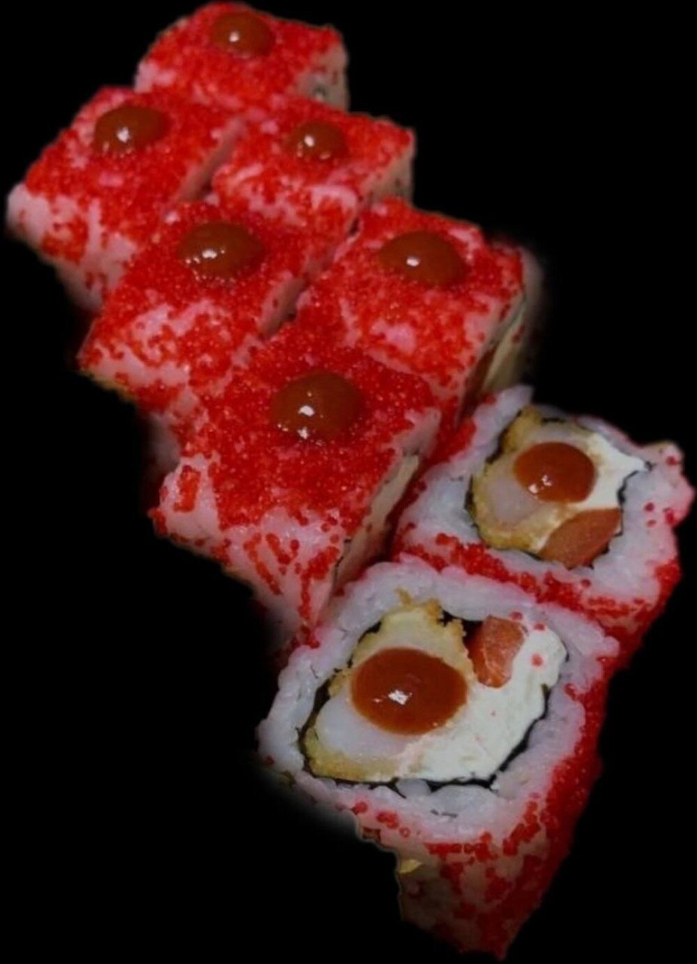 Рис, нори, креветка темпурная, масаго красная, соус кимчи, сыр филадельфия, перец.