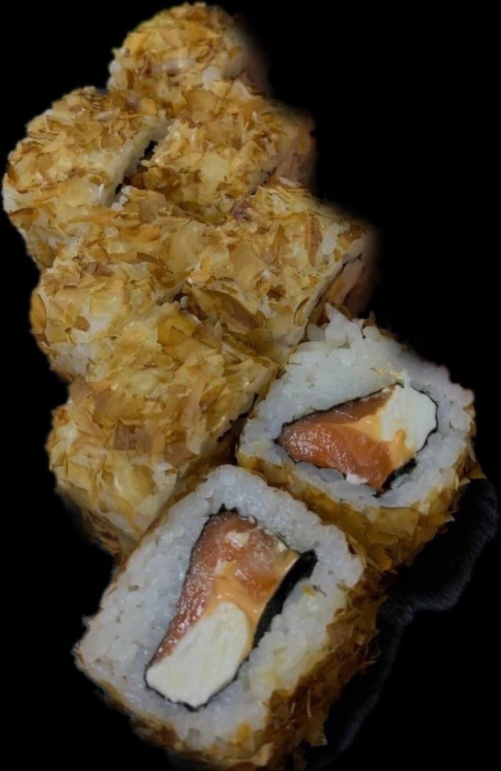 Рис, нори, стружка тунца,сыр филадельфия, лосось, спайси соус