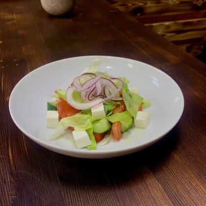 Креветки, салат Айсберг, помидор, сухарики, сыр Пармезан, соус.