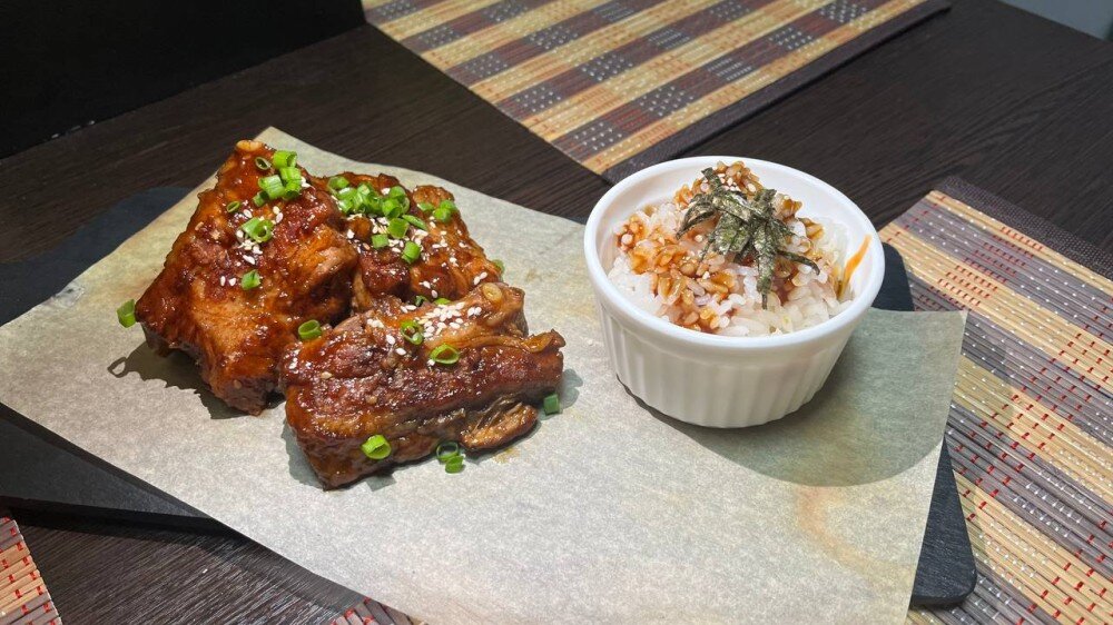 Ребра свиные, имбирь свежий,соль, перец, соус BBQ, кунжут, соевый соус, рис.